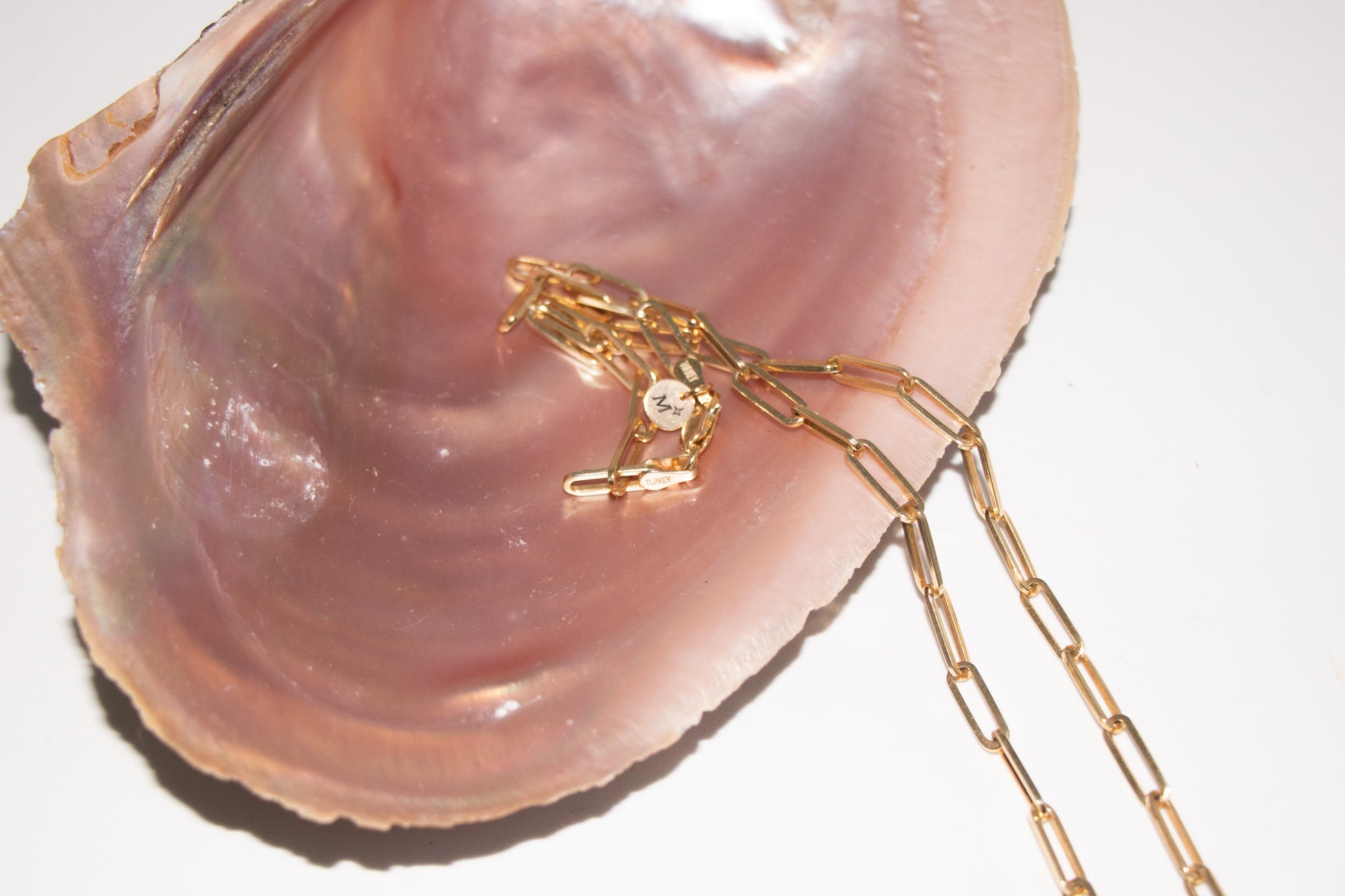 Chain is recycled 925 sterling silver plated with 18k gold. Carabiner is 18k gold plated sterling silver.