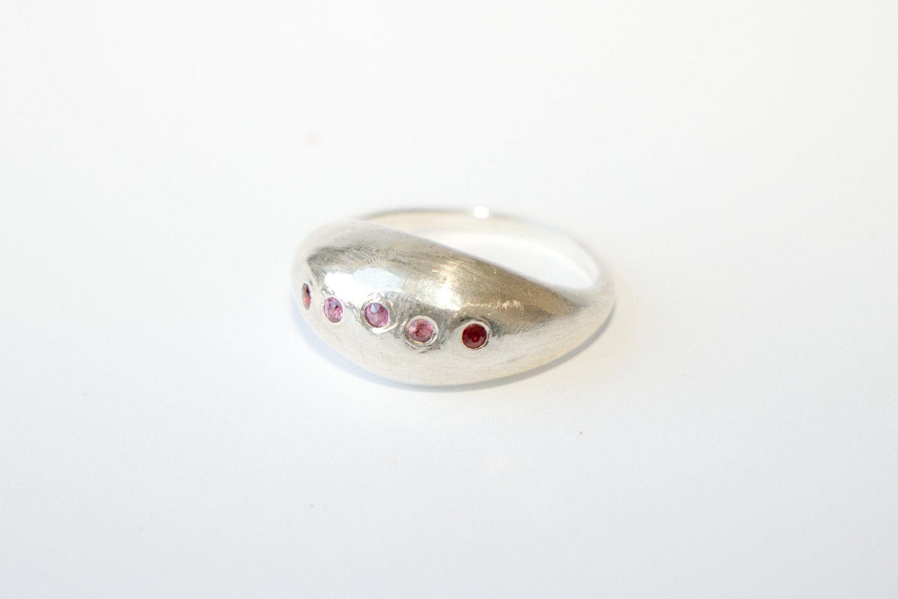 Hand set with a line of 3 centered magenta rhodolite garnet, ending with 2 Kenyan rubies.