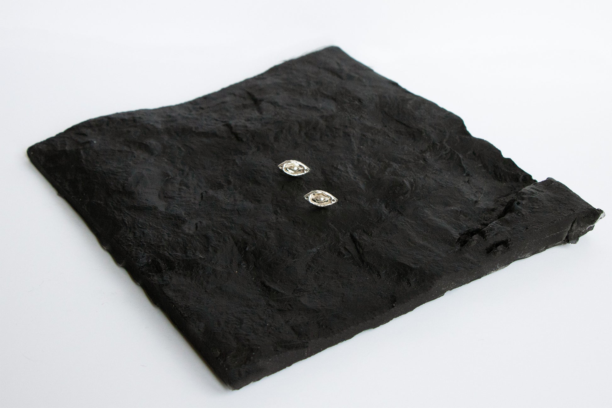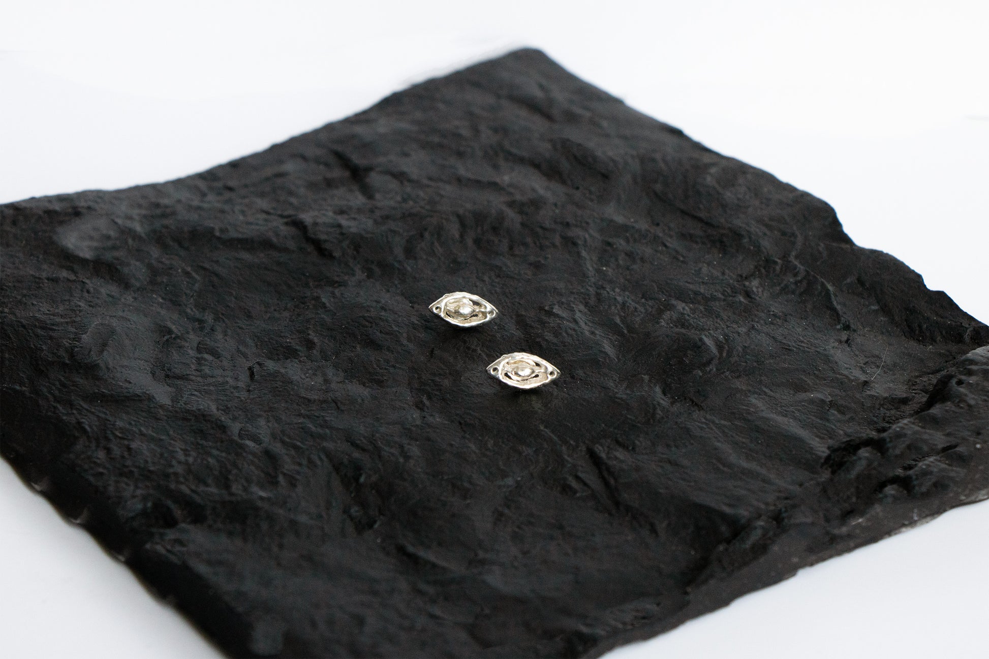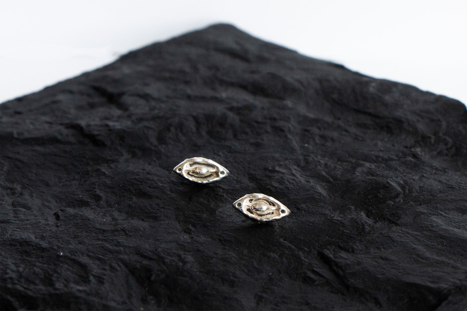 Surrealist inspired, hand-carved eye motif. High polish finish. Casted in 925 Sterling Silver. Sterling Silver posts and backs. Also available in 14k gold.