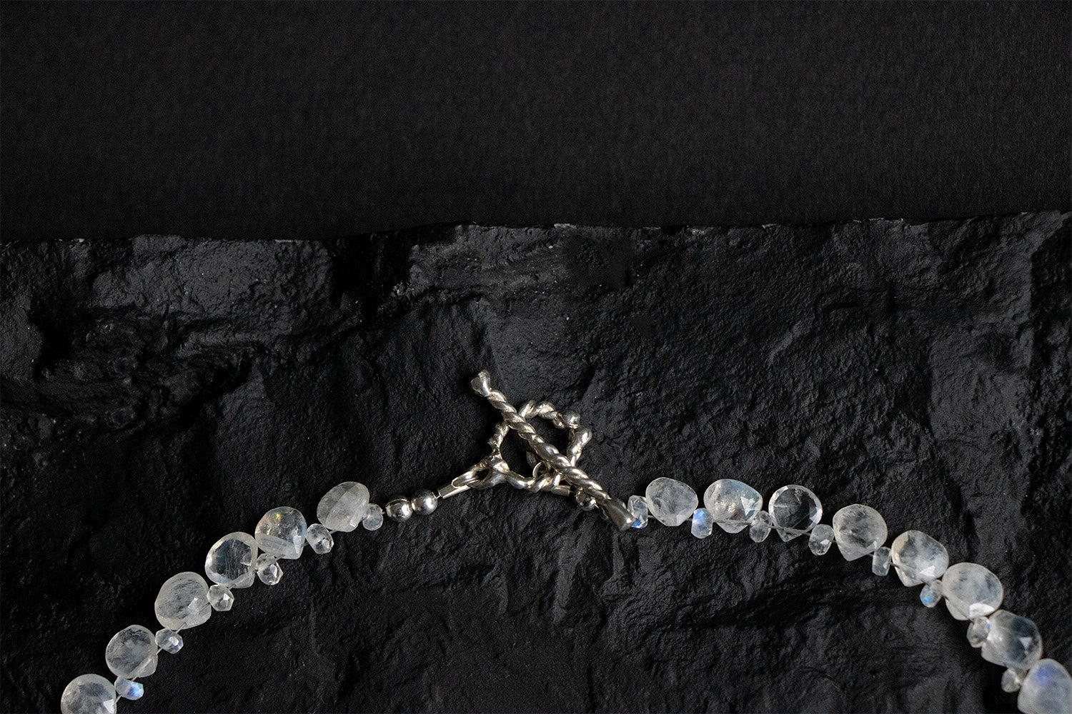 A delicate choker of icy moonstone briolettes, finished with a hand carved twisted toggle clasp cast in 925 sterling silver. Inspired by the alchemy of stalagmites, where time passes in a frozen dreamscape.