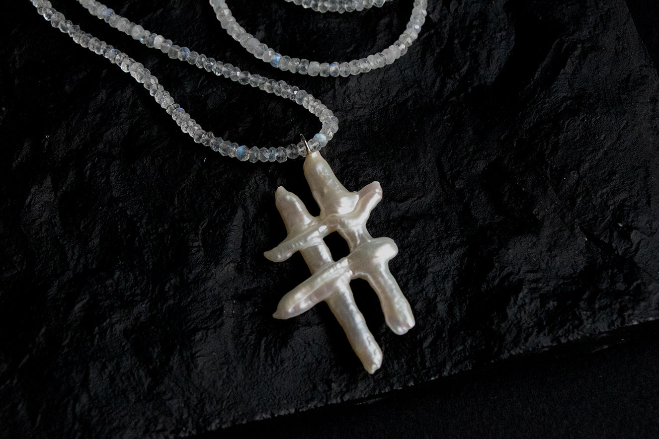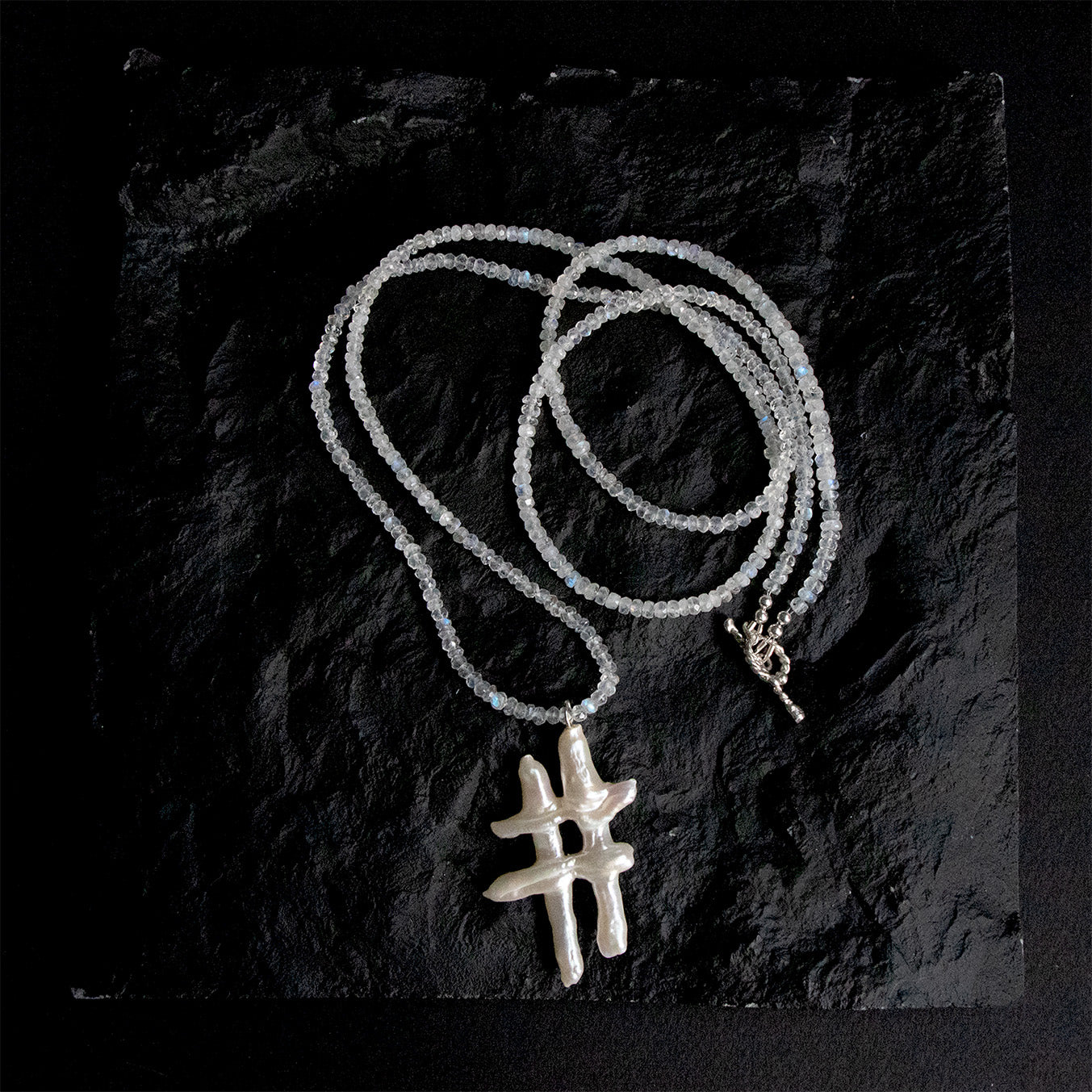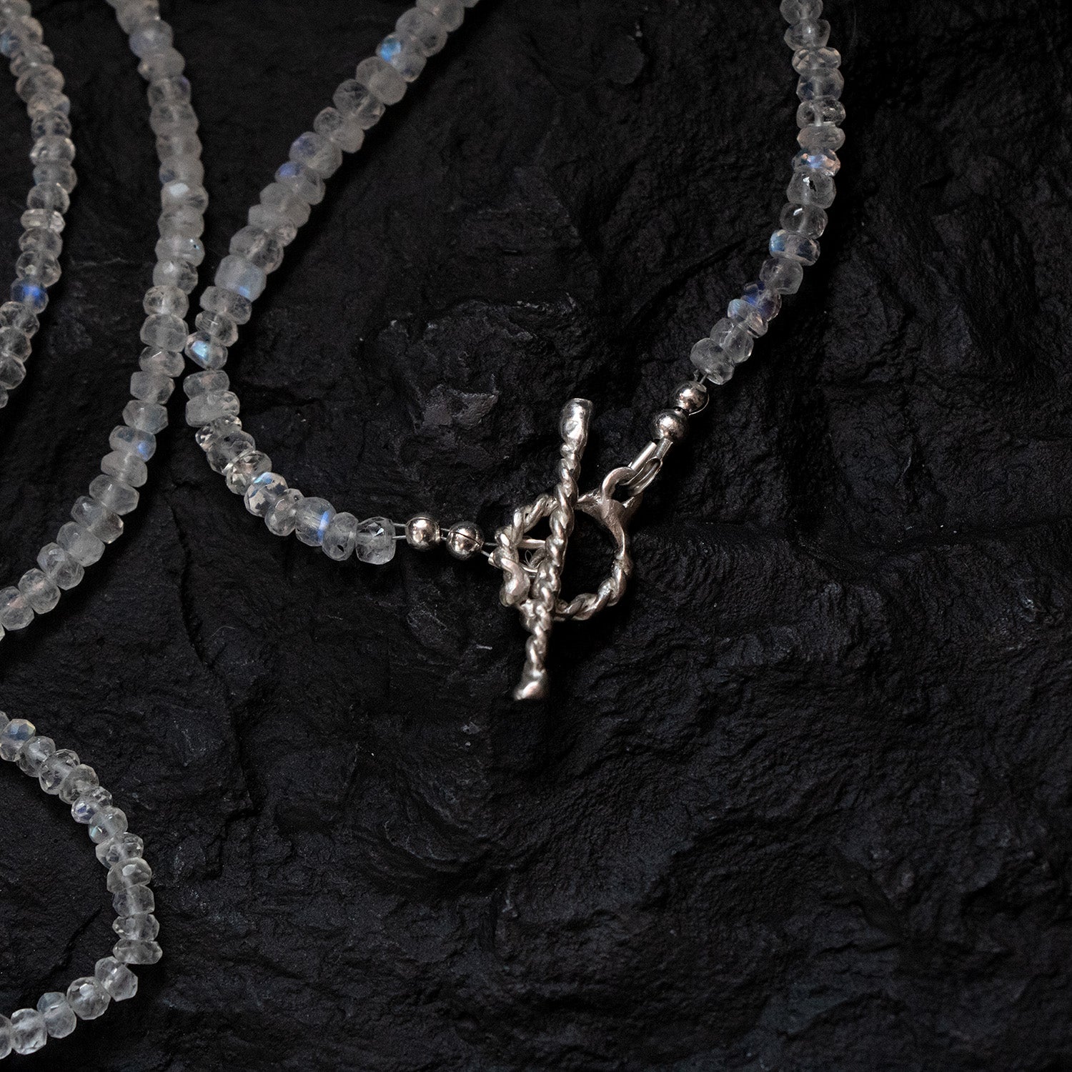 A long strand of ice-like, delicate, and faceted moonstone centered by a hand drilled hashtag pearl. Finished with a hand carved twisted toggle clasp cast in 925 sterling silver. A study in opacity and form, drawn from the surreal stillness of ice caves and their layered textures.