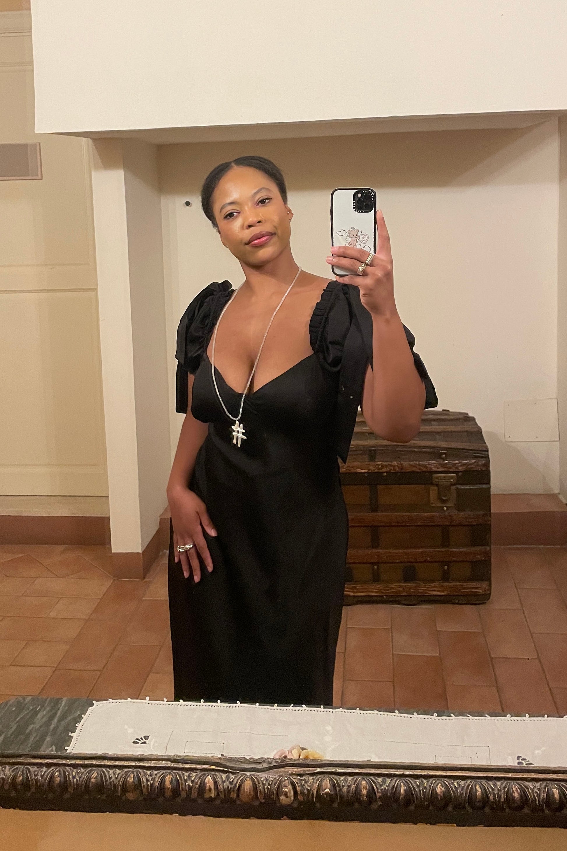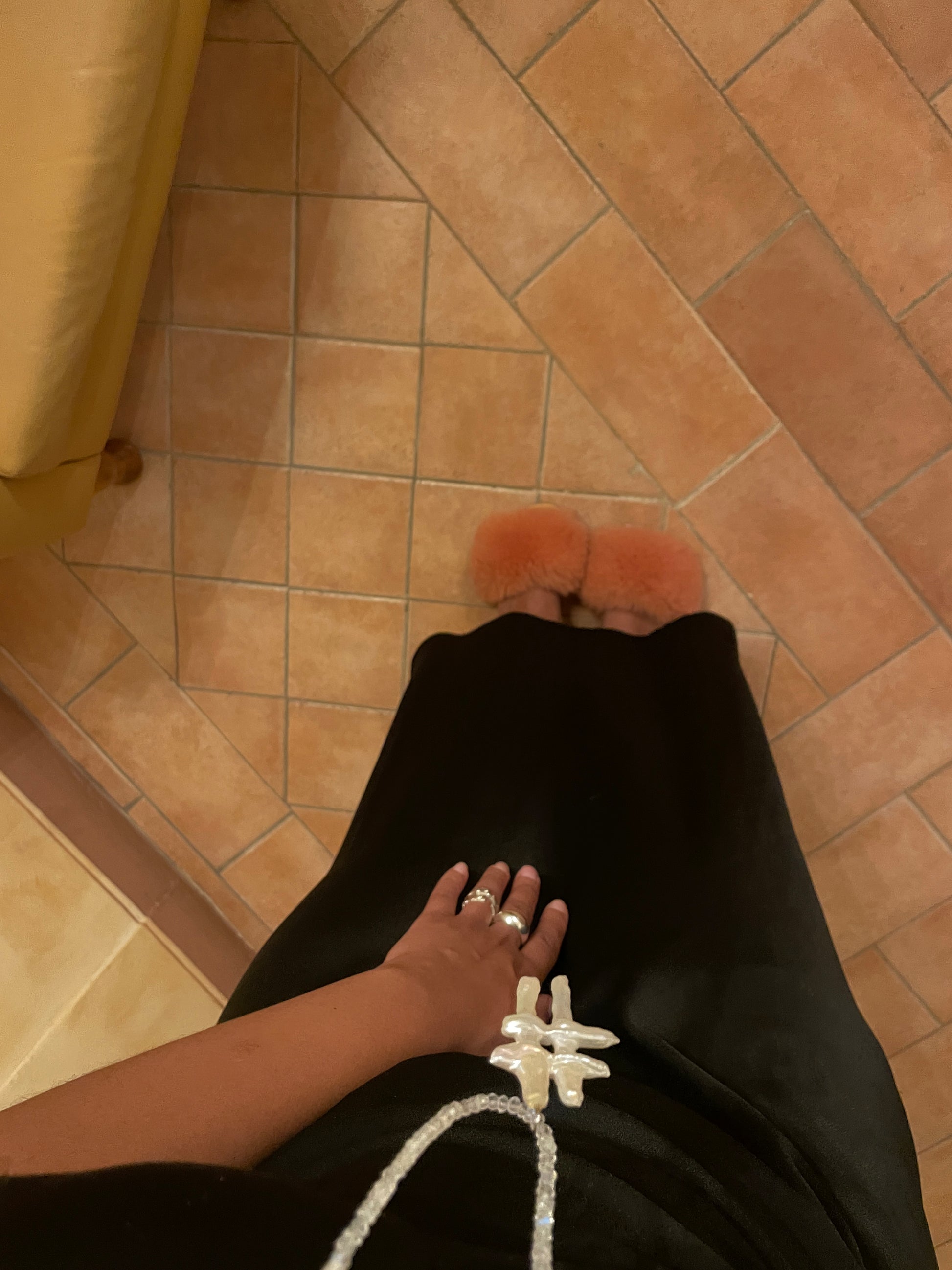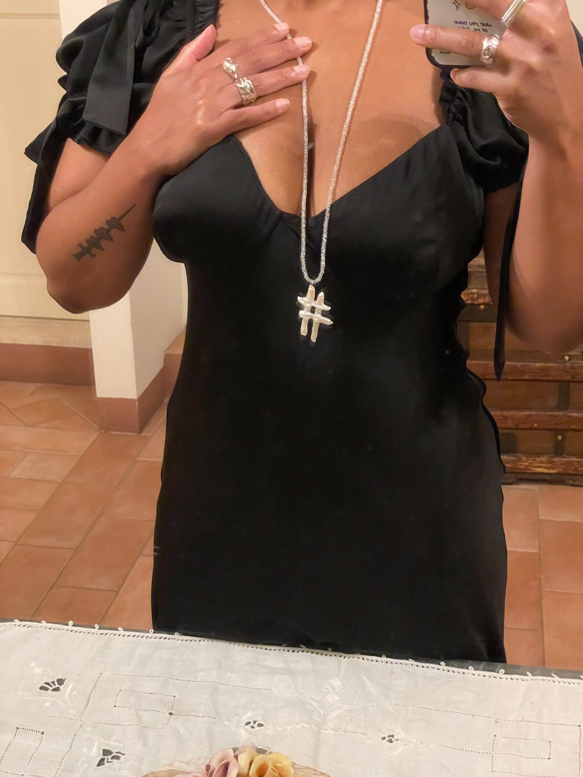 In Umbria, Italy Maddy wears the Moonstone Hashtag Pearl Necklace, with the Dome 001 ring, Parallelogram ring, Organic Ring 002, and the Wide Eye ring.