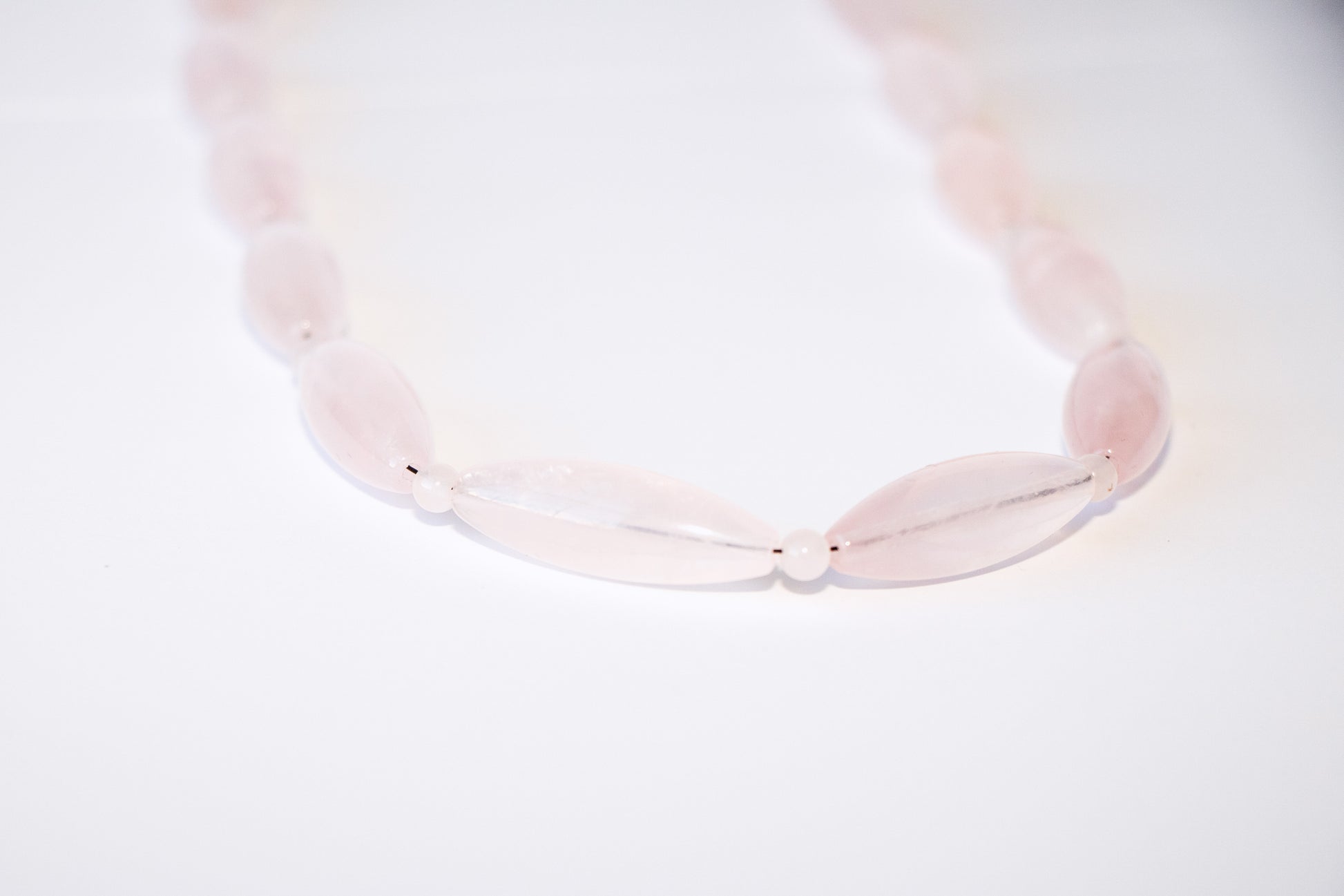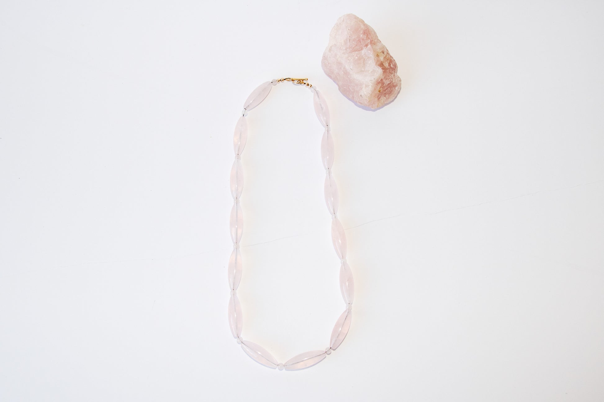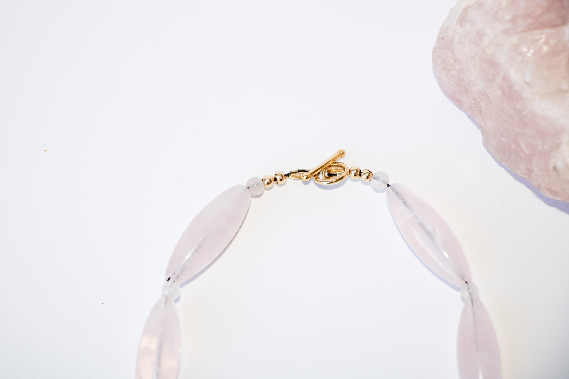 Sheer, sweet, pink rose quartz necklace with a 14k gold toggle clasp. Strung a contrasting black for added depth. I love to play with the opacity of these gemstones to find ways to spotlight their depth.