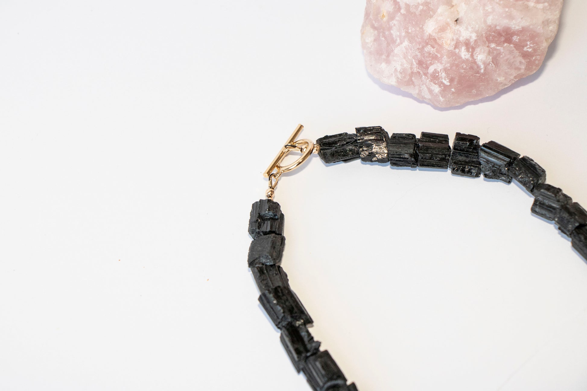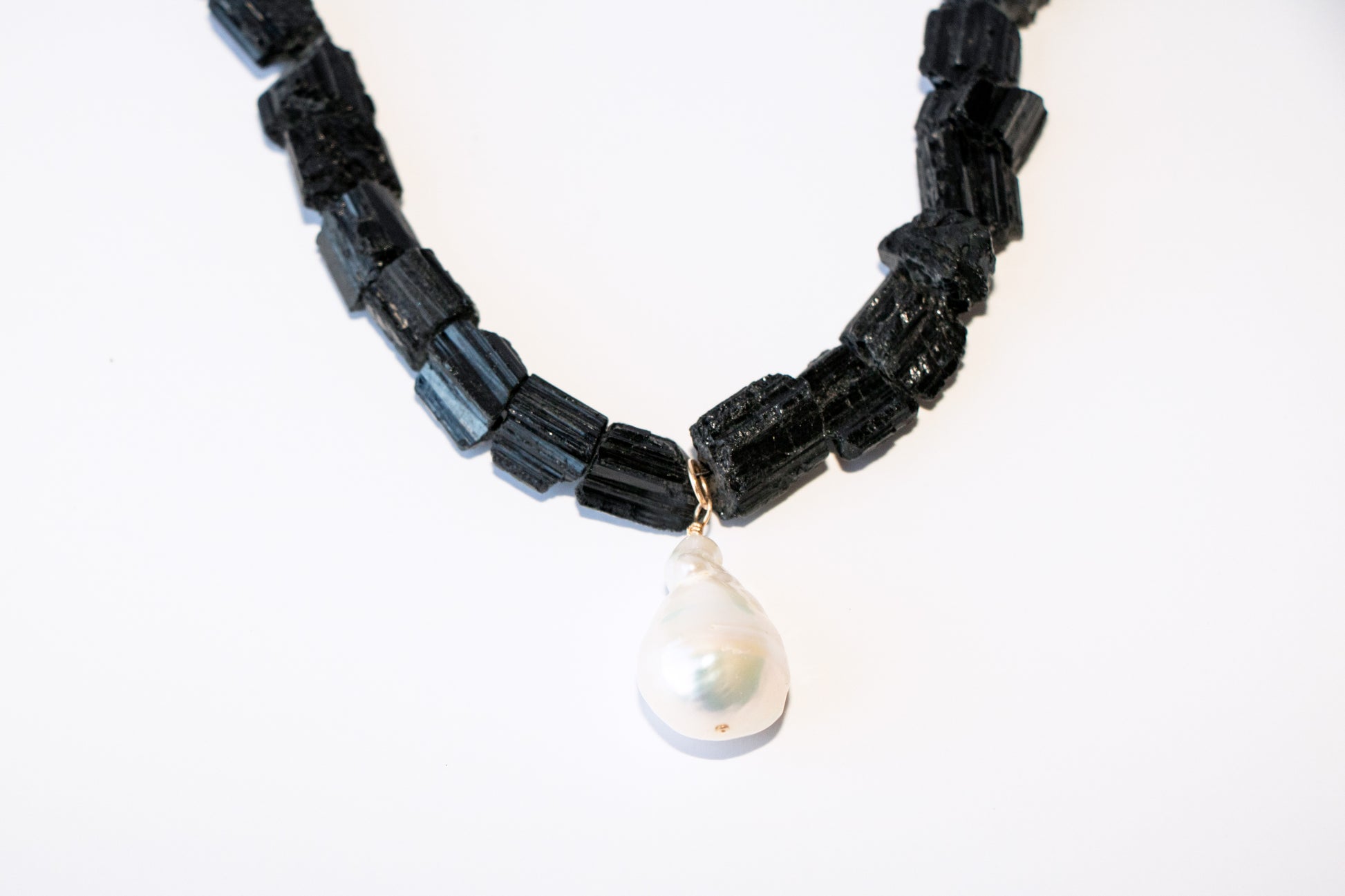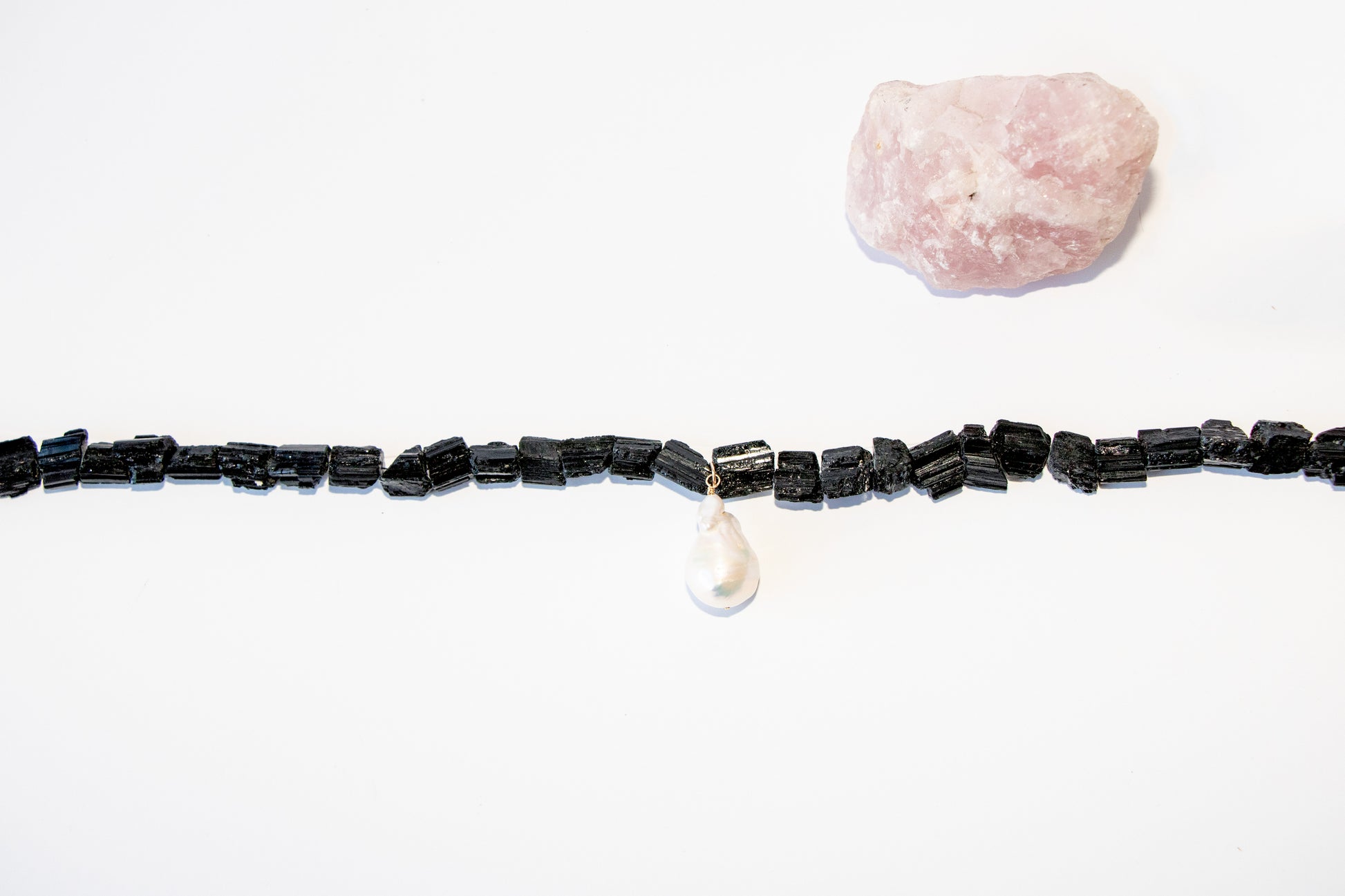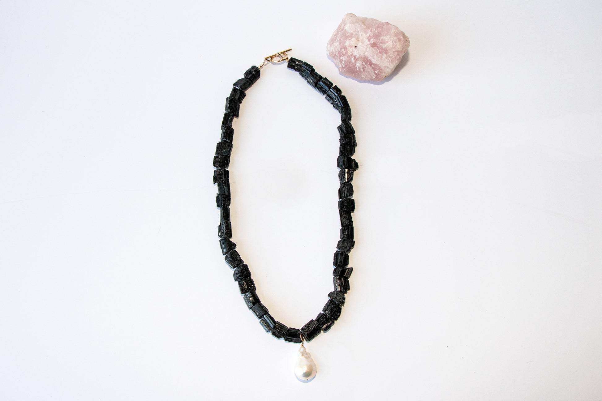 Raw, unfinished, cuts of black tourmaline, paired with a baroque white freshwater pearl pendant. Finished with a 14k Gold toggle clasp.