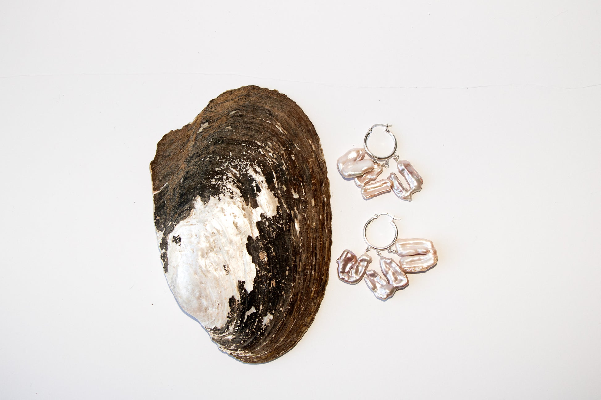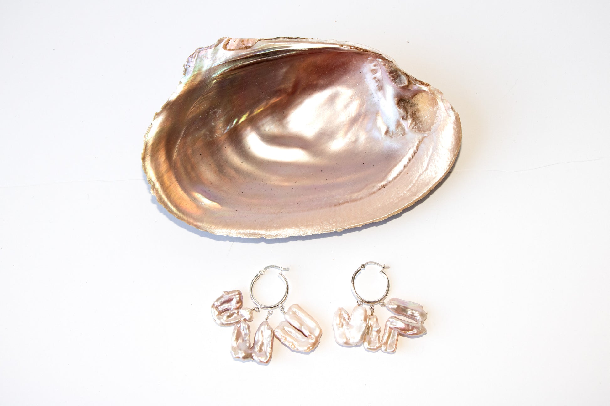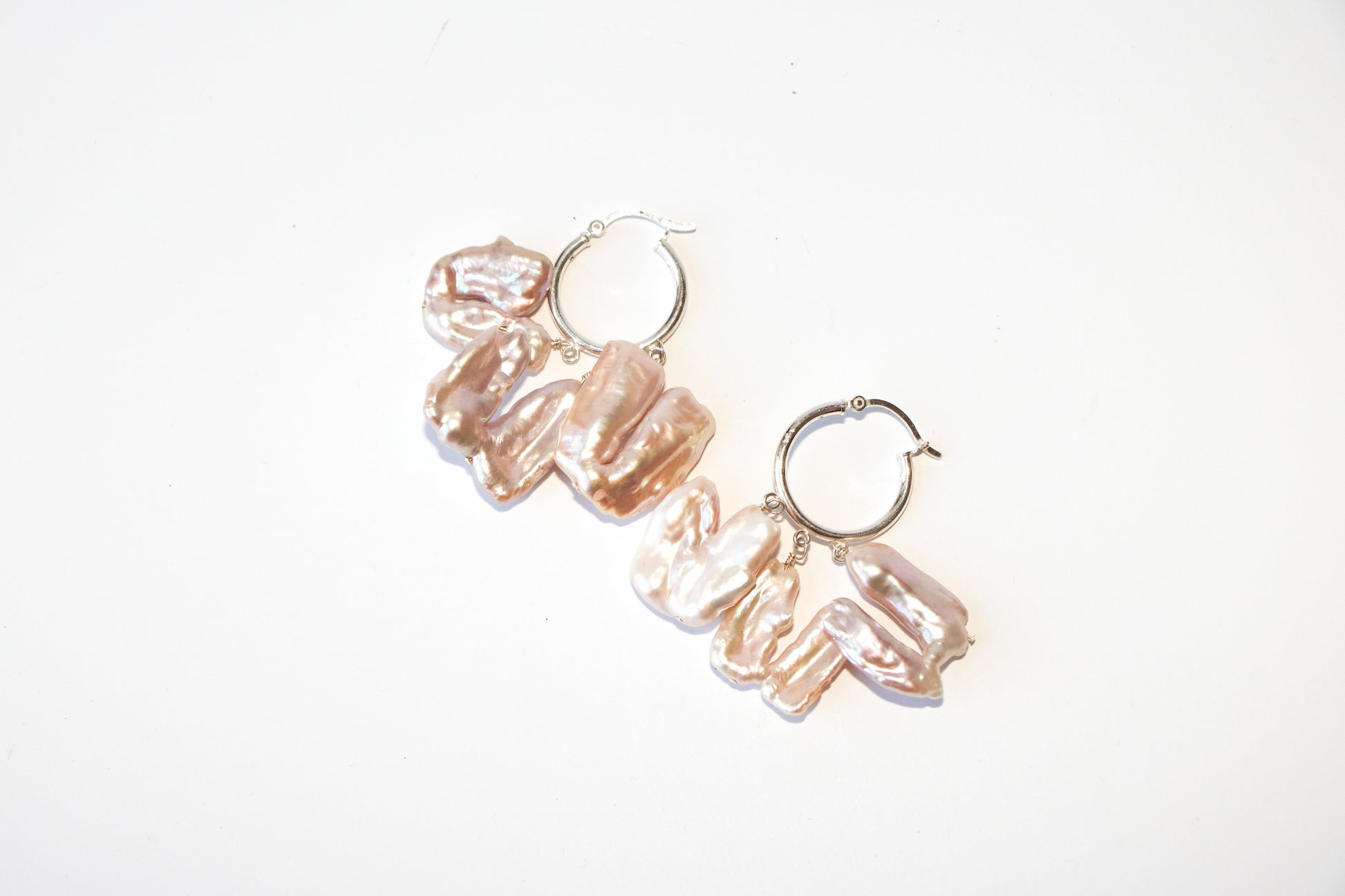 Three iridescent, irregular, mauve-y, Keshi pearls on 925 Sterling Silver hoops. These freshwater pearls are naturally grown in these irregular shapes overtime via the mussel's natural nacre. I adore their irregular form and lustrous color. Say thank you nature.